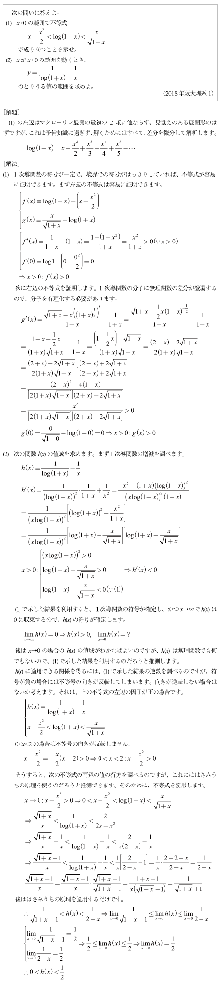 [C]微分不等式と関数の値域の問題(2018年阪大理系1)