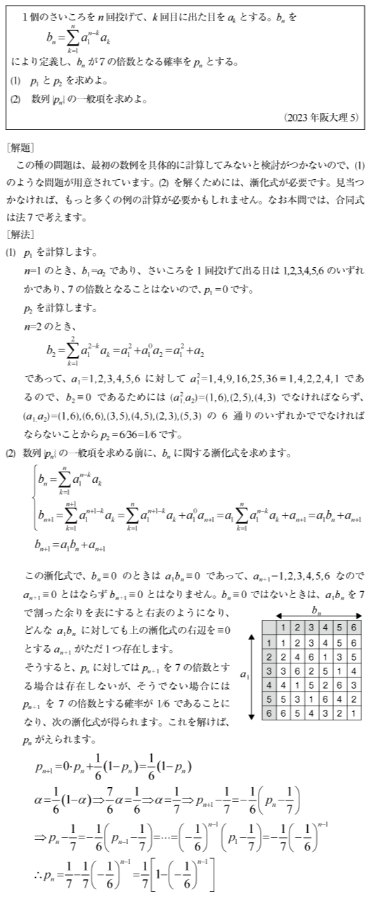 [D]サイコロの目からなる級数が7の倍数となる確率の問題(2023年阪大理5)