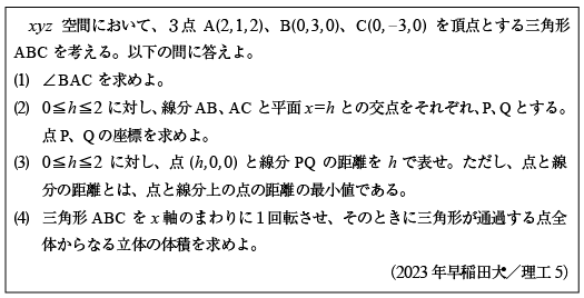 [C]y軸に底辺を持つ三角形をx軸周りに回転した立体の体積の問題 (2023年早大/理工5)