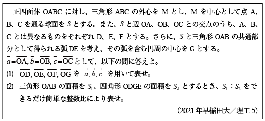 [C]正四面体の底面正三角形の外接球の問題(2021年早大/理工5)