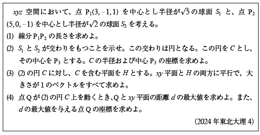 [C]斜めに交差する2つの球の交差円の問題(2024年東北大理4)