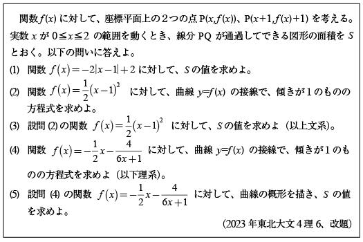 ●今週の名問 このコーナーでは、受験生の皆様に是非ご紹介したい、1問で多くの内容をマスターできる名問を不定期でご紹介します。 [C]対数の対数関数の相接と定積分問題(2019年秋田大理6)