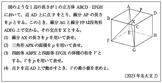 [B]立方体内部の角錐の体積の問題(2023年名古屋大文2)