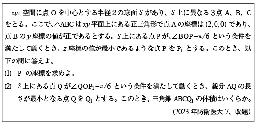 [D]球面を円錐で切り抜いた円周上の点の問題(2023年防衛医大7)