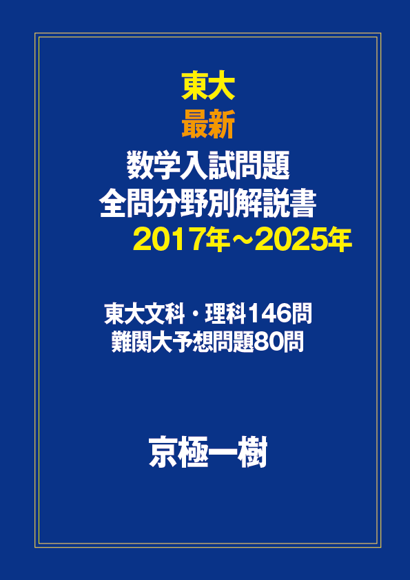 TOP PAGE2026年数学入試問題解答大学別年度別目次(国公立大)大学別年度別目次(私立大)分野別入試問題目次東大入試は易しくなったのか入試突破高速テクニック最新運営状況最新販売状況■御注文・お問い合わせの手引き 2026年版数学入試問題集最強最新の数学入試対策書籍 京極一樹の出版書籍京極一樹の特製本京極一樹の個人指導今週の名問復活!今週のダメ解答の解きなおし復活![小稿集]■東大入試の突破の方法■初めて見た問題が解けるようになる方法■入試対策はいつから始めるのか [以降は分校です]分校 TOP PAGE