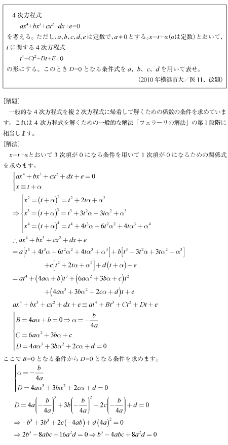 [A]4次方程式の奇数次項を消去する問題(2010年横浜市大/医11)