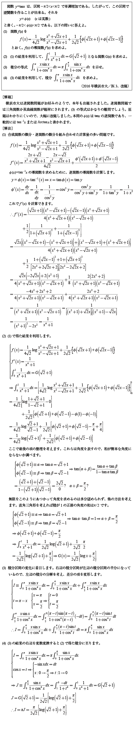 [C]三角関数の逆関数の応用問題(2016年横浜市大/医3)