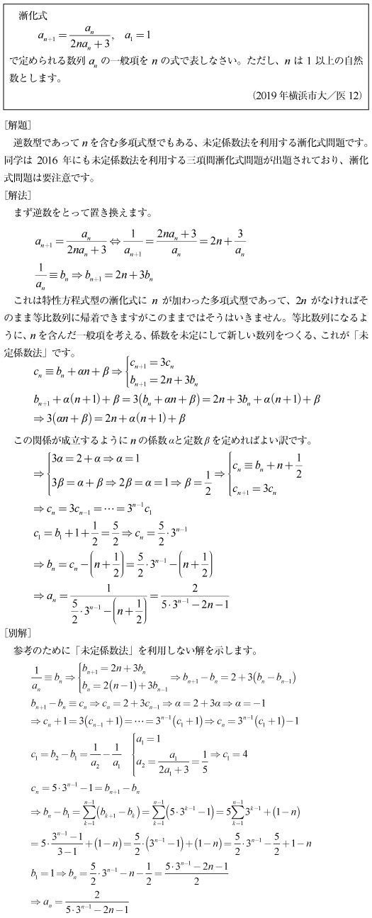 [C]nを含む逆数型の漸化式を未定係数法を使って解く問題(2019年横浜市大/医12)