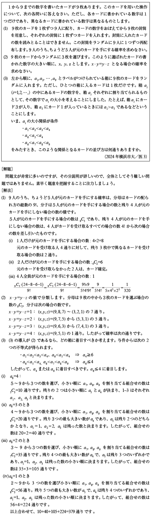 [C]9枚のカードに関する確率と場合の数の問題(2024年横浜市大/医3)