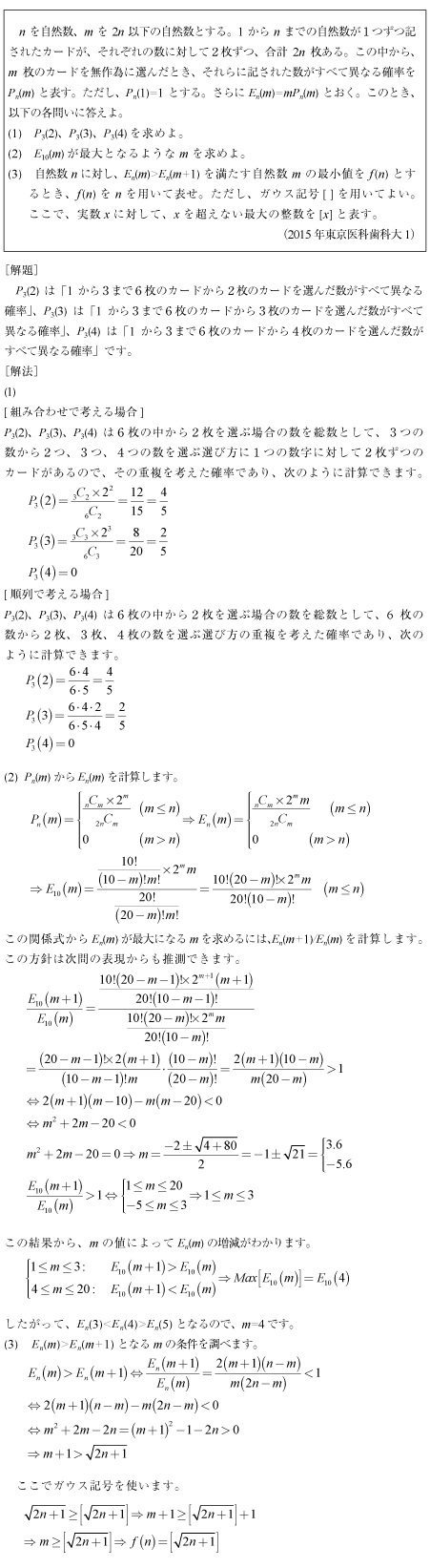 [C]2n枚のカードからm枚のカードを選ぶ確率の問題(2015年東京医科歯科大1)