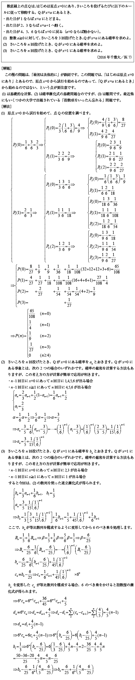 [D]特性方程式・指数型漸化式を解くゲーム確率の問題(2016年千葉大/医7)