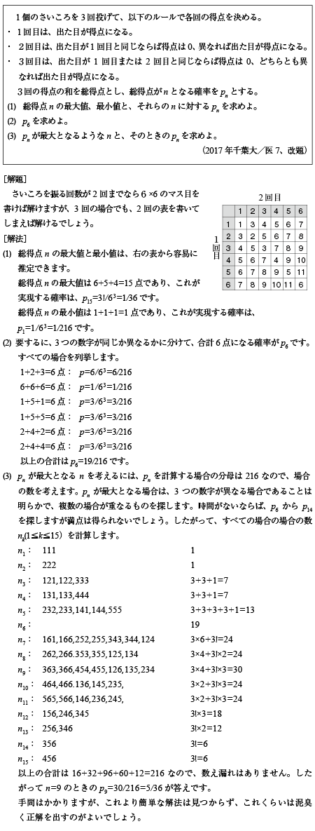 [B]さいころを3回投げるゲームの確率の問題(2017年千葉大/医7)