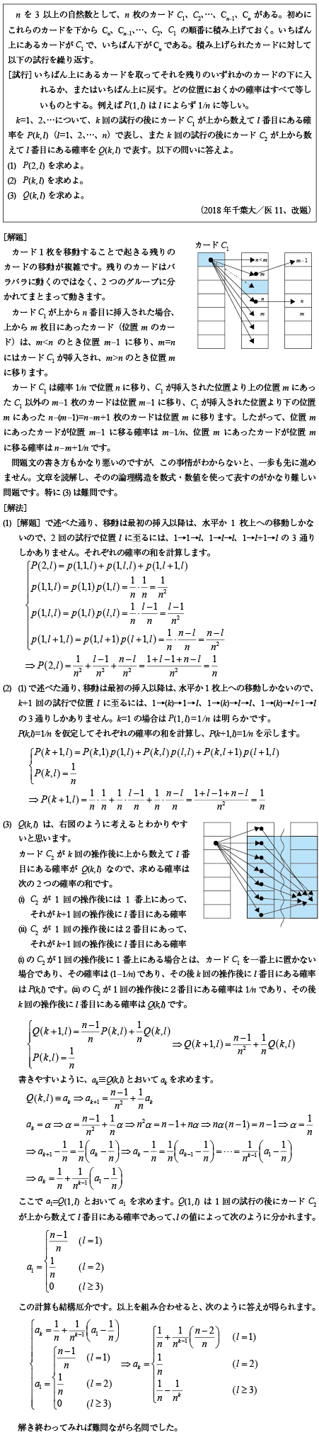 [D]積み上げたカードの並べ替えの確率漸化式の問題(2018年千葉大/医11)