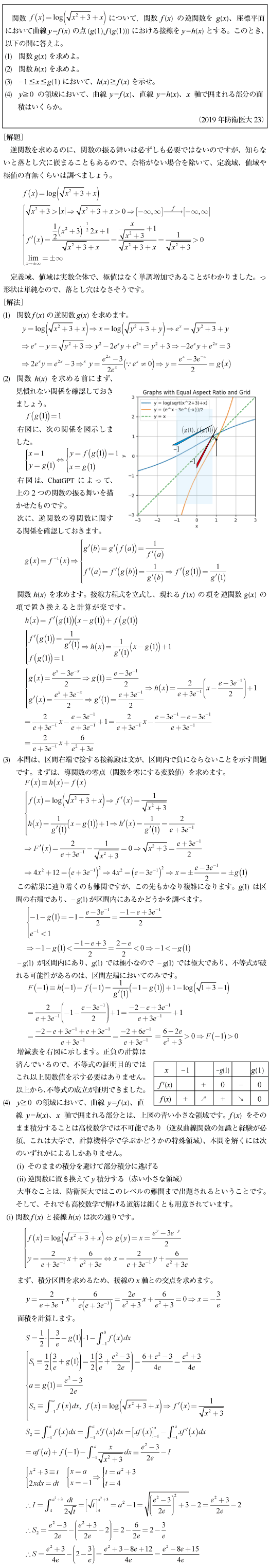 [D]対数関数の逆関数と面積積分の問題(2019年防衛医大23)