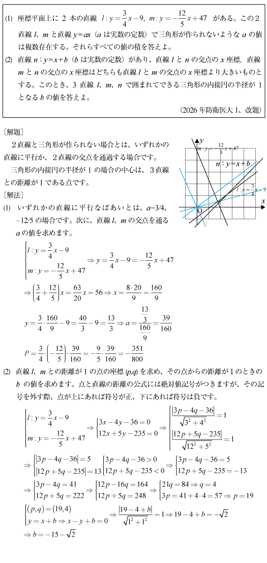 [B]3直線が作る三角形とその内心の問題(2026年防衛医大1)