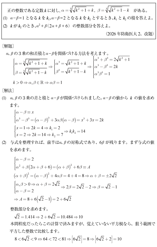 [B]2つの3乗根の問題(2026年防衛医大2)