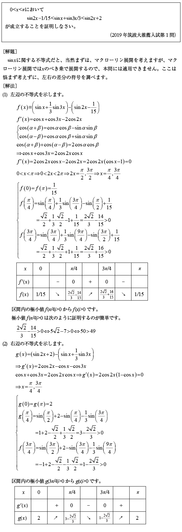 [B]三角関数の微分不等式の問題(2019年筑波大推薦/医1)
