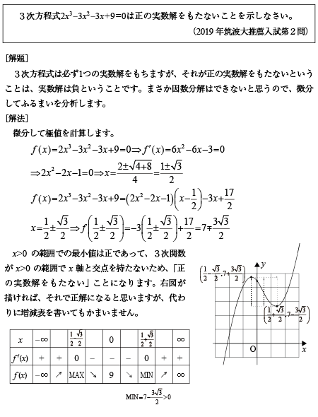 [B]3次方程式の正の実数解の問題(2019年筑波大推薦/医2)