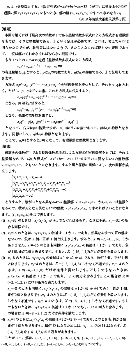 [B]4次方程式の有理数解の問題(2019年筑波大推薦/医3)