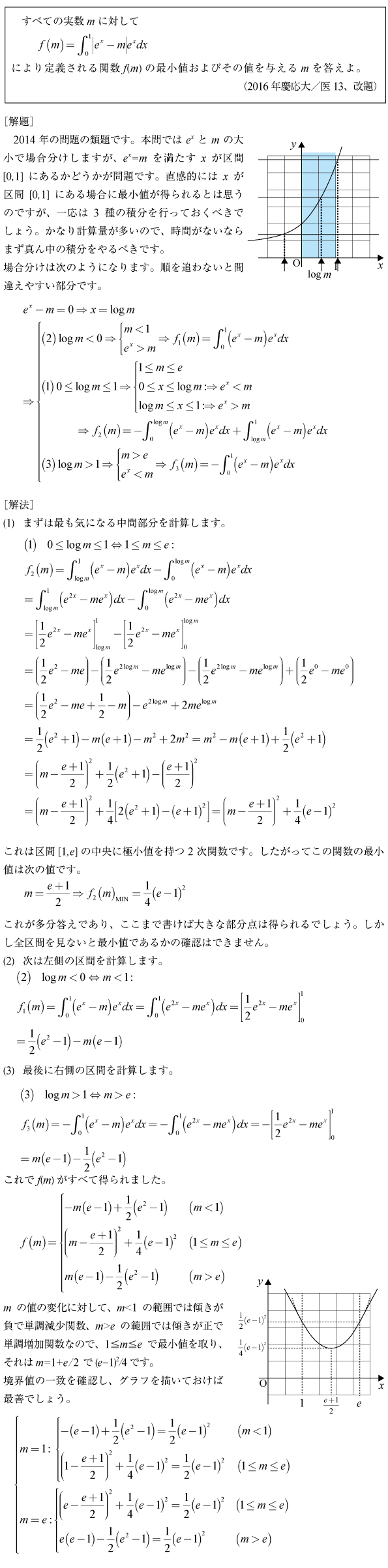 [B]絶対値記号付定積分の最小値の問題(2016年慶応大/医13)
