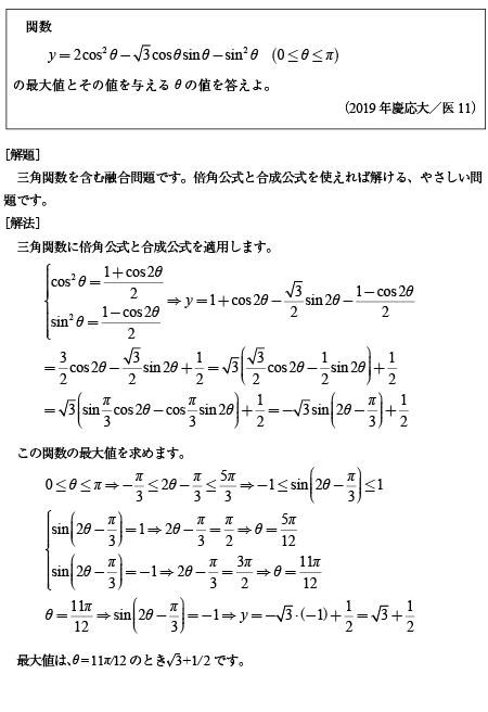 [A]三角関数の最大値を求める問題(2019年慶応大/医11)