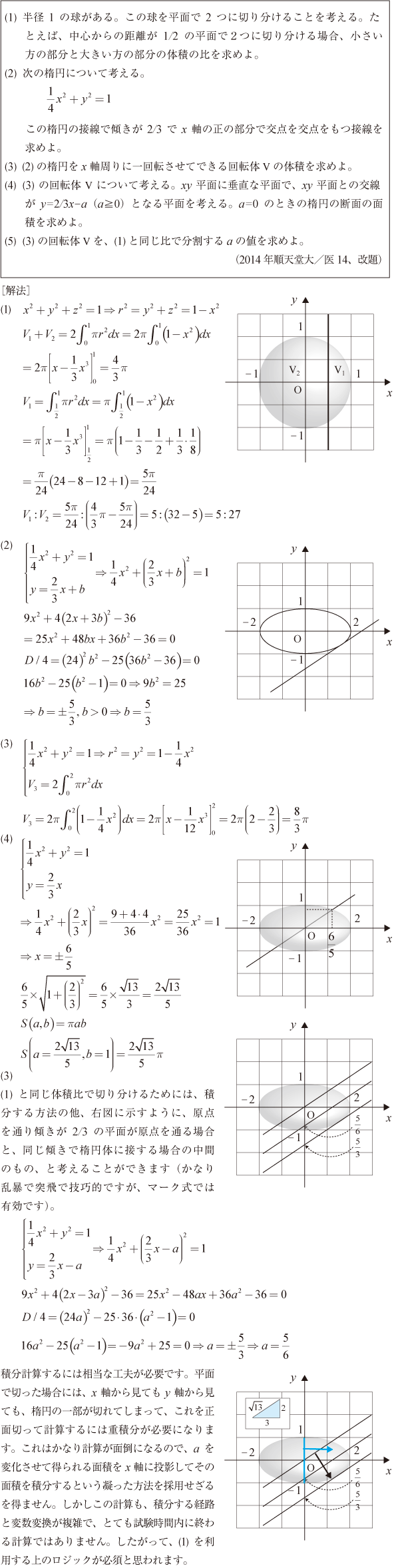 [D]楕円体の体積の計算問題(2014年順天堂大/医15)