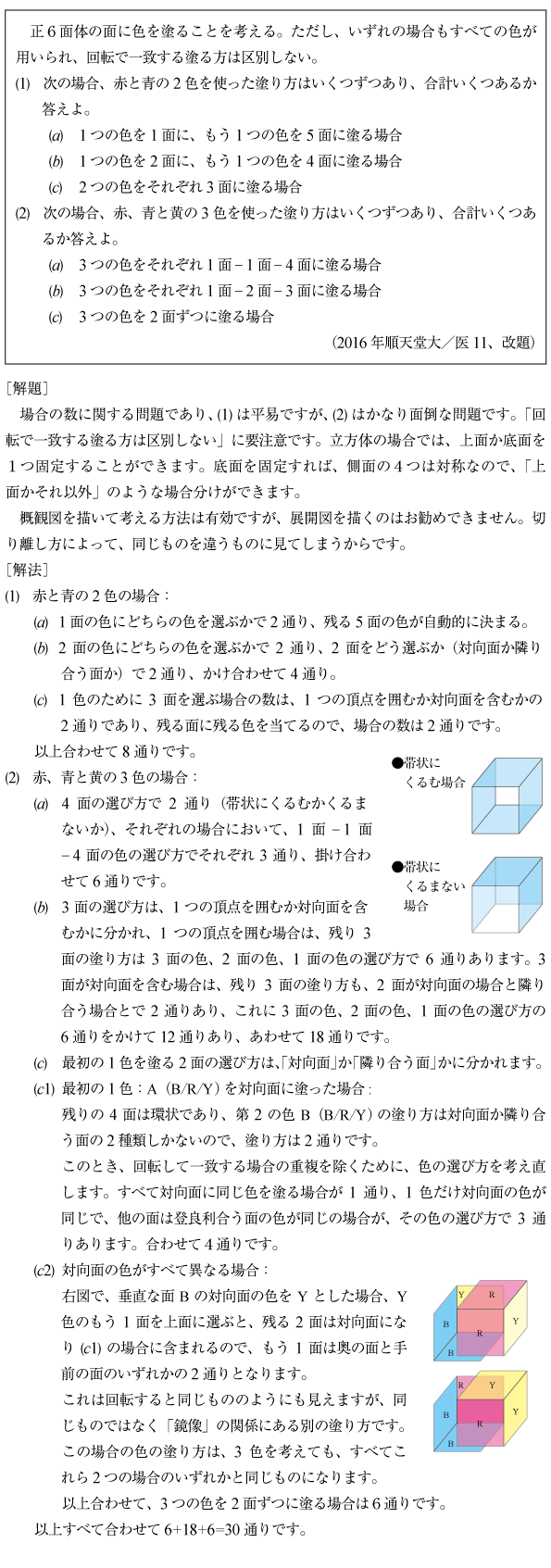 [C]立方体の各面を塗る場合の数の問題(2016年順天堂大/医11)
