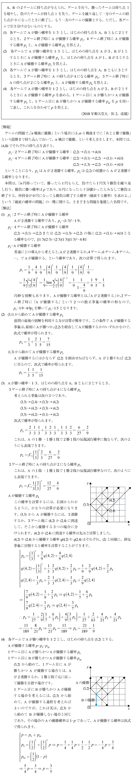 [C]確立漸化式で解く破産の確率の問題(2018年順天堂/医2)
