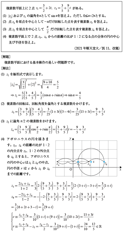 [A]複素数平面上のやさしい問題(2021年順天堂大/医11)
