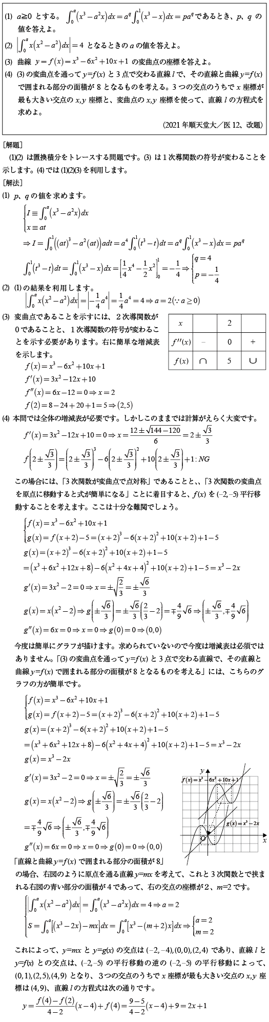 [C]3次関数の積分と平行移動の問題(2021年順天堂大/医12)