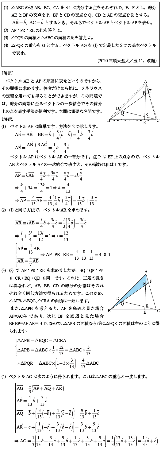 [B]三角形の内分点による三角形のベクトル問題(2020年順天堂大/医11)