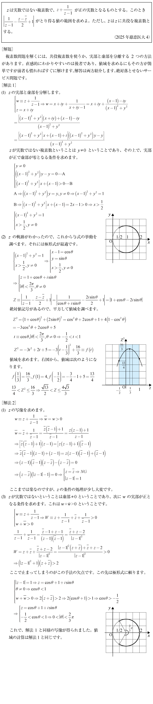 [B]複素数平面上の写像と値域の問題(2025年慈恵医大4)