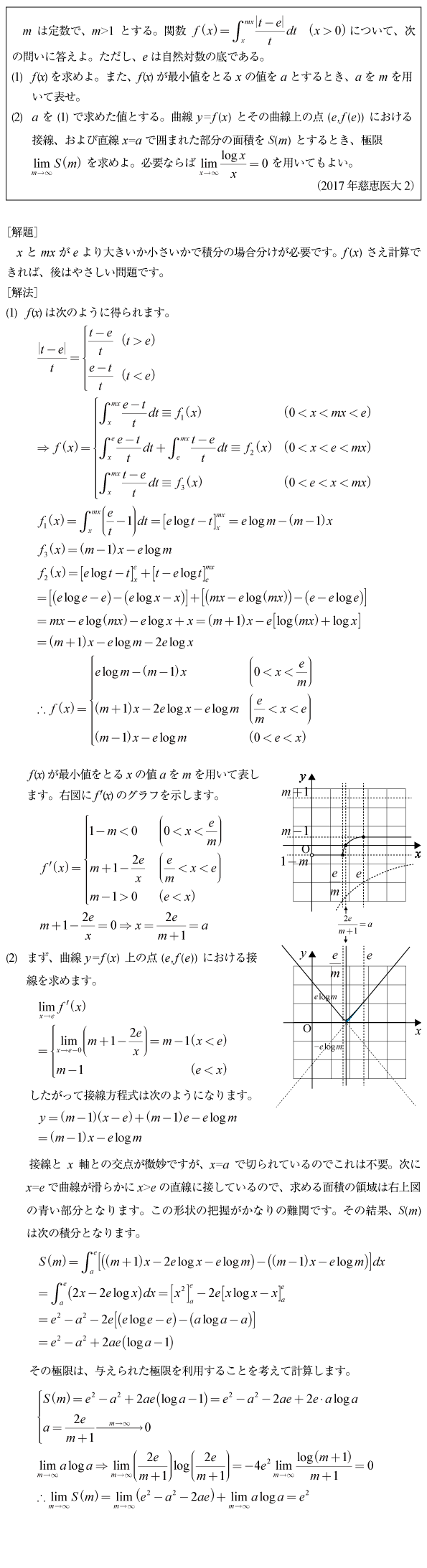 [D]絶対値記号付積分の極限の問題(2017年慈恵医大2)