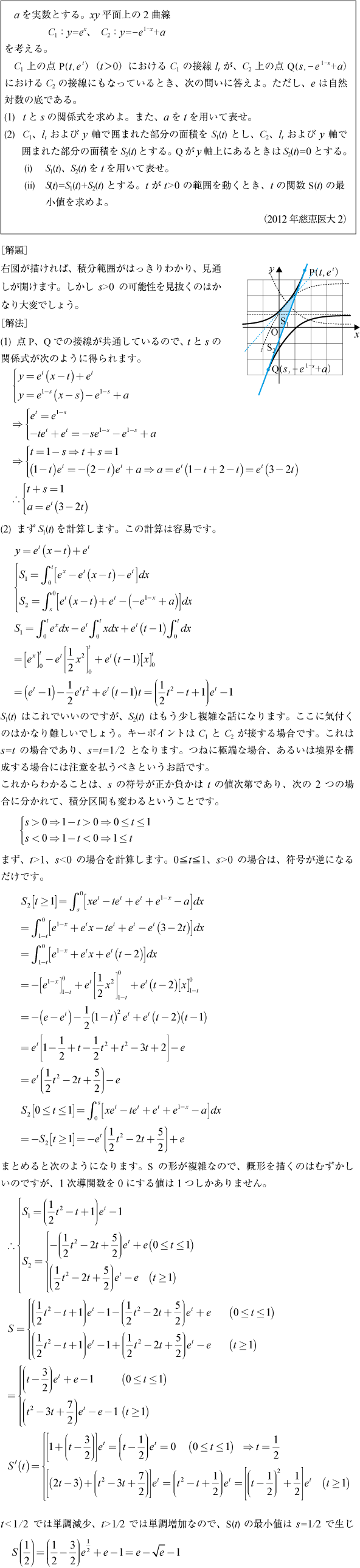 [C]指数関数とその接線が囲む面積を求める問題(2012年慈恵医大2)