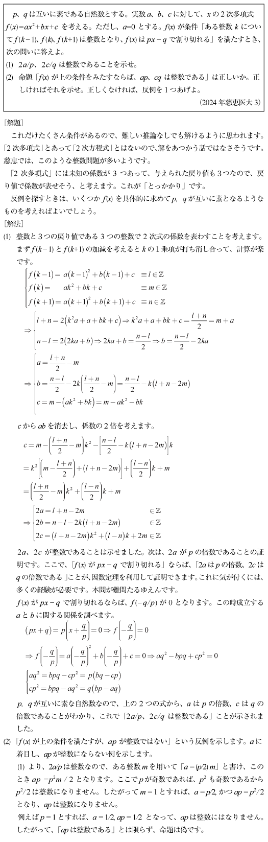 [C]2次式係数の整数性・倍数性の問題(2024年慈恵医大3)
