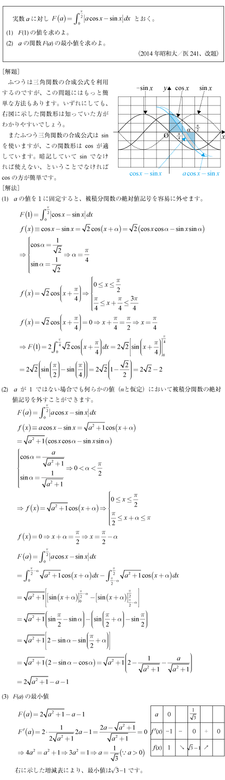 [B]絶対値記号付三角関数の積分の最小値を求める問題(2014年昭和大/医241)