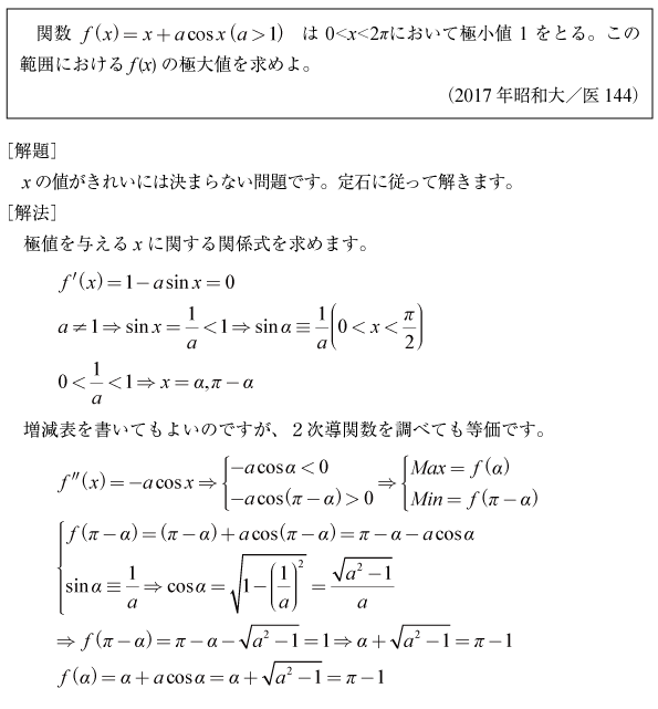 [B]三角関数の角度不明で極大値を求める問題(2017年昭和大/医144)