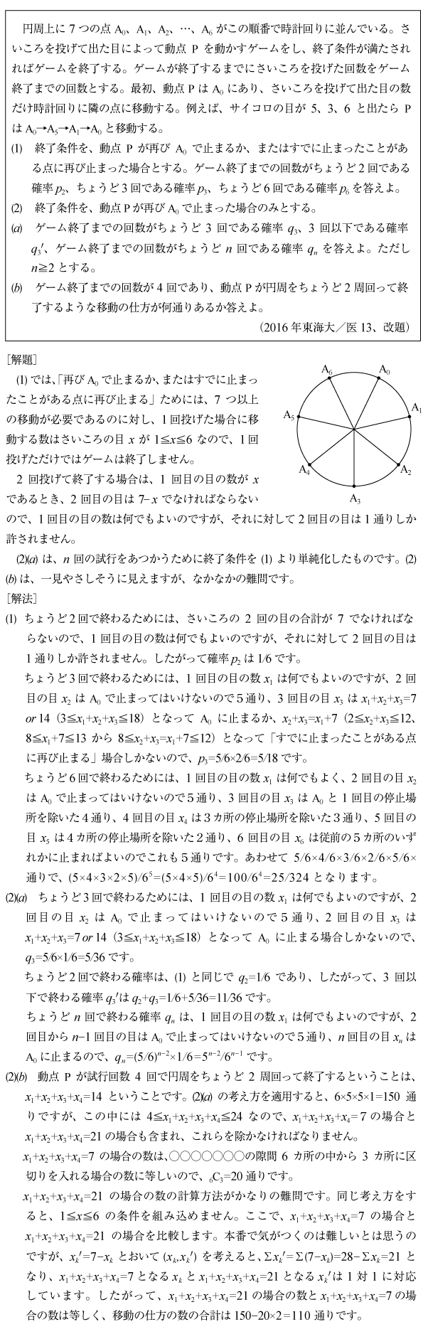 [C]七点円上を移動するゲームの確率の問題(2016年東海大/医13)