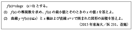[B]対数を含む関数の最小値と面積計算の問題(2015年東海大/医231)