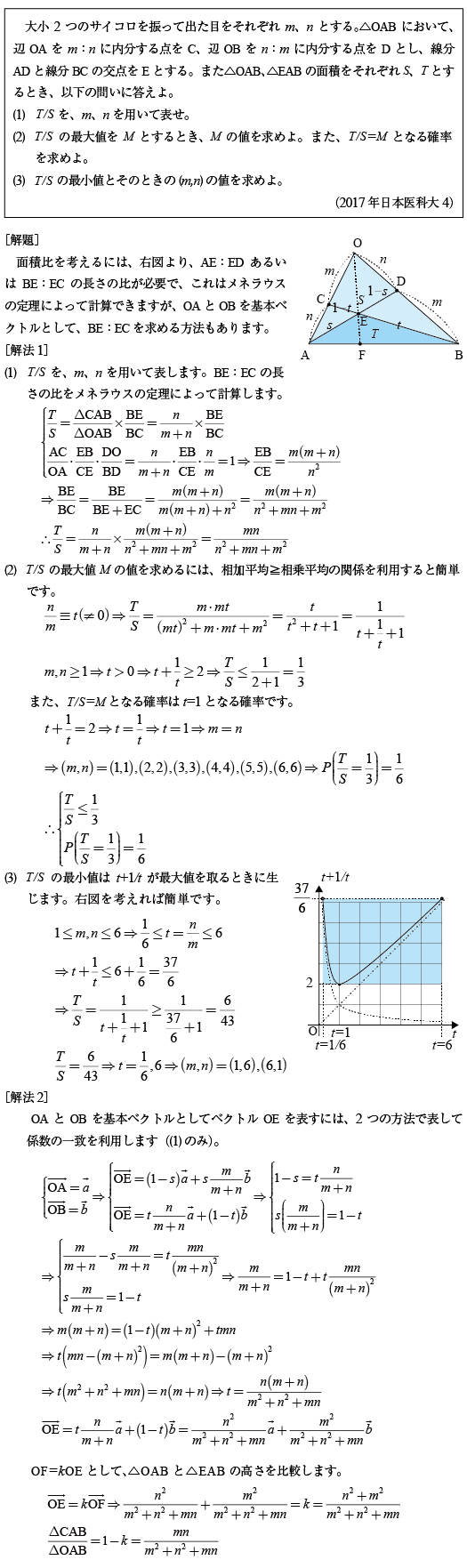 [B]メネラウスの定理と確率の問題(2017年日本医科大4)