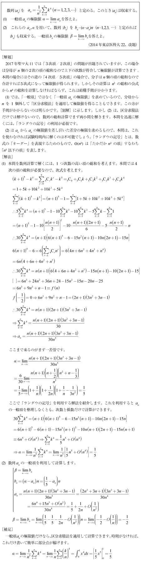 [C]自然数の4乗和を使って計算する極限値の問題(2014年東京医科大22)