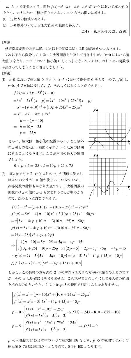 [C]5次関数の極大値の大きさを不等式で示す問題(2018年東京医科大21)