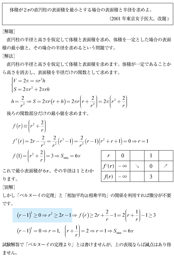 [B]体積一定で表面積最小の直円柱の問題(2001年東京女子医大)