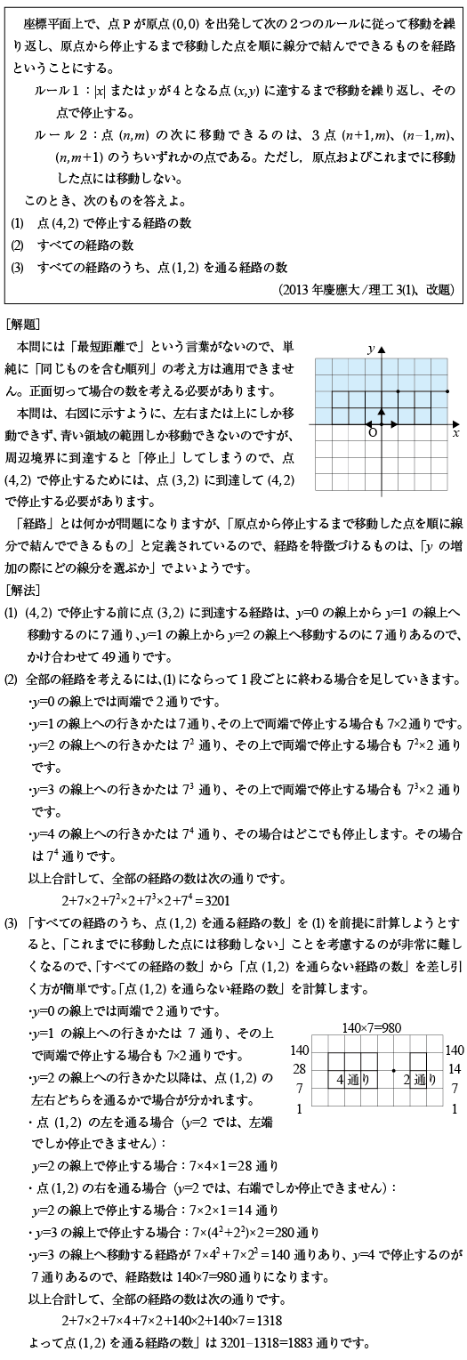 [D]最短距離ではない経路数の問題(2013年慶大/理工31)