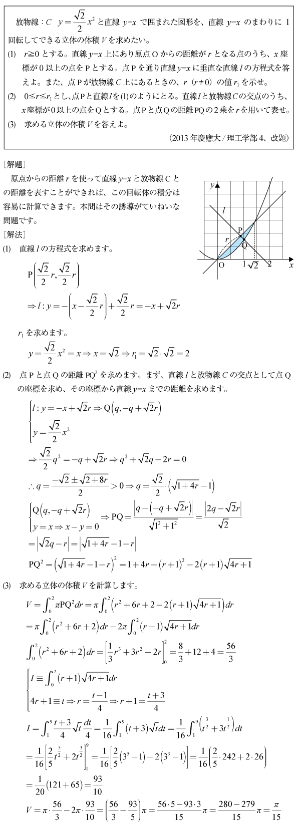 [C]y=xまわりの回転体の体積の問題(2013年慶應大/理工4)