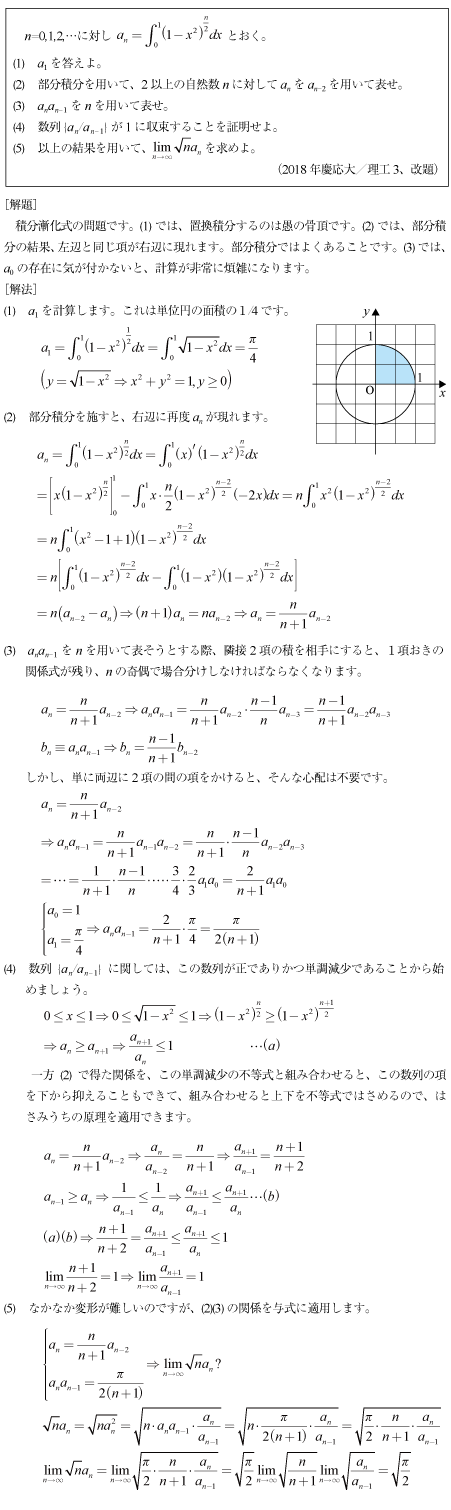 [C]積分漸化式のやや複雑な問題(2018年慶応大/理工3)