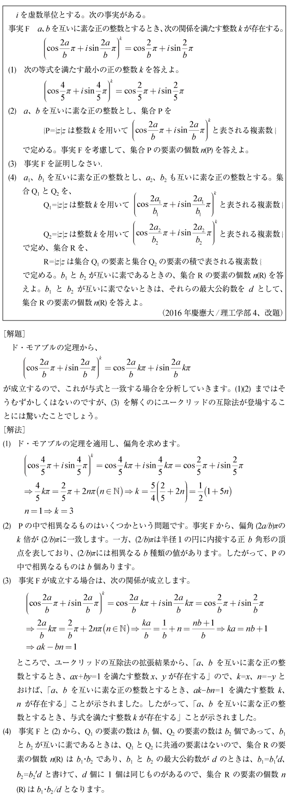 [D]複素数とユークリッド互除法の問題(2016年慶応大/理工4)