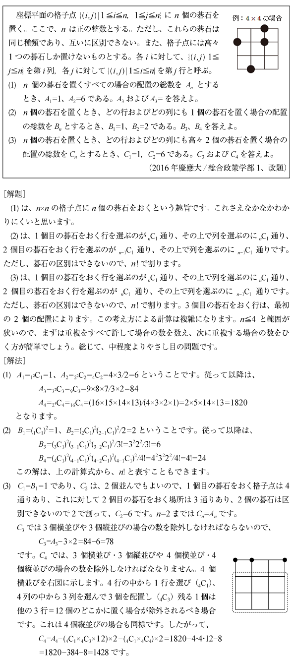 [C]碁盤上に碁石をおく場合の数の問題(2016年慶應大/総合政策1)