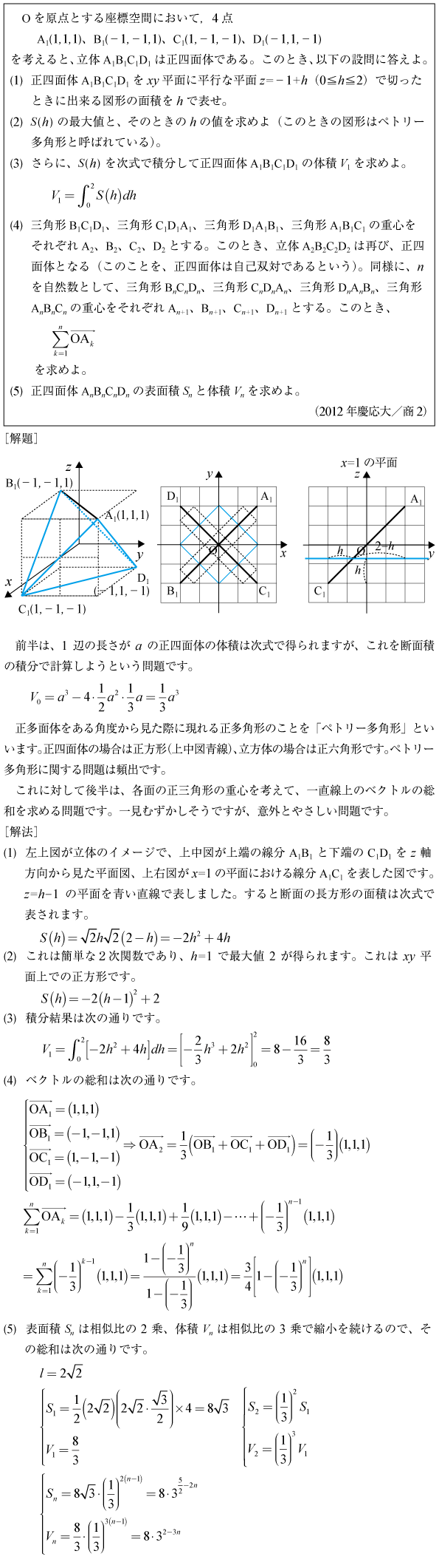 [B]正四面体の断面積・体積積分と表面積の問題