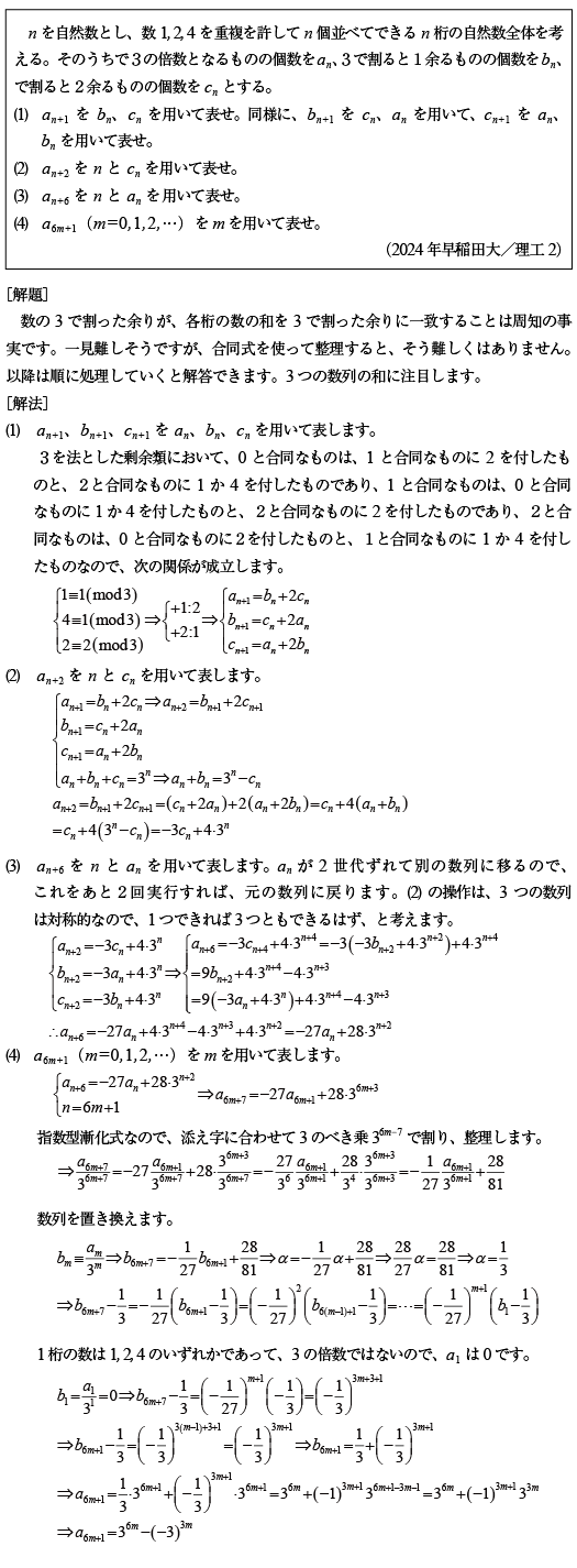 [B]剰余類に関する3つ組の数列の問題(2024年早稲田大/理工2)
